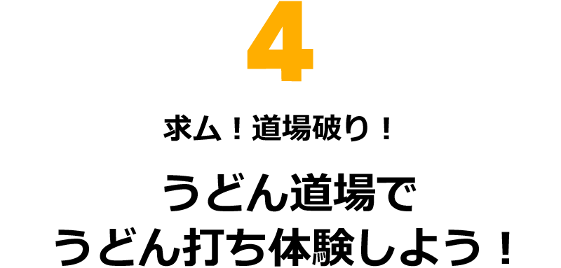 - 作る、遊べる、食べれるが一度に楽しめるうどん作り体験!ちょっとクセの強い道場主から繰り出される、数々の試練を乗り越えながら、世界にたった1つだけのマイうどんを作ろう!自分で打ったうどんとなると味は格別!どんな御馳走よりも、思い出に残る一杯になること間違いありません!2名様からのお申し込みで参加できます★