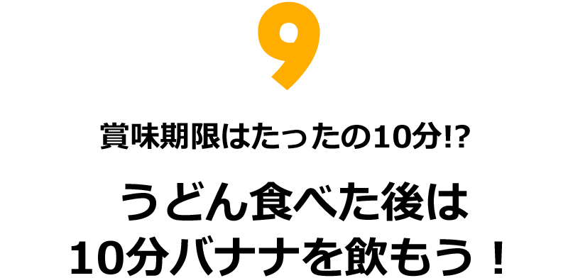 - 香川初のバナナジュース専門店はなんとうどん屋だった!バナナに豊富に含まれるカリウムには、摂りすぎた塩分を体の外に排出する作用があるんです。「うどんの後にバナナを飲んで健康になってほしい。」との思いで、バナナジュース専門店10分バナナをオープンしました。バナナと牛乳だけで作る濃厚バナナジュース。賞味期限は10分なのでお早めにお飲みください!